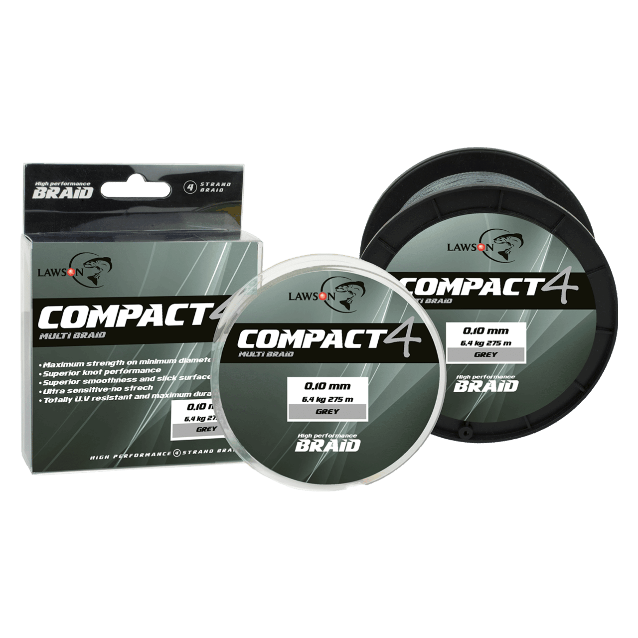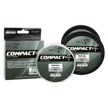 Lawson Compact 4 er en nyutviklet flettet line. Etter over ett år med testing av diverse liner falt valget på denne høykvalitetslinen. Den er kompakt flettet med fire stumme hovedtråder som ikke strekker seg og som gjør det vanskelig for vannet å trekke inn i lina. Hovedtrådene er pakket med mange ultratynne og råsterke PE Dyneema-fibre for optimal styrke. Compact4 er så rund som man får den med fire tråders fletting, og nettopp rundhet minimaliserer sjansen for vindknuter. Den gir også høyere slitasjestyrke og kanskje det aller viktigste – høy knutestyrke. Alt for mange legger for mye vekt på høy bruddstyrke og ser konsekvent på kiloene som er trykket på spolen, men hva hjelper vel det hvis knutestyrken er dårlig! Husk å bruke opptil én stanglengde med mono- eller fluoro karbon sene som fortom ned til agnet. Fortommen blir mindre synlig for fisken og mer slitesterkt for fiskeren når lina gnisser over en stein etc. ved bunnapp.